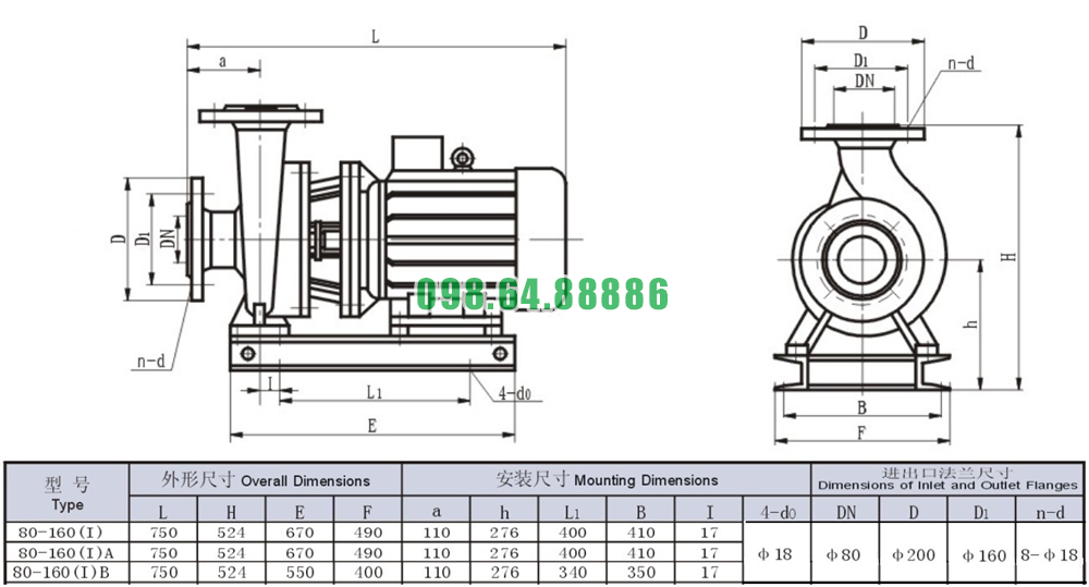 Bảng thông số kỹ thuật bơm nước li tâm trục ngang SLW80-ISW80-160-I