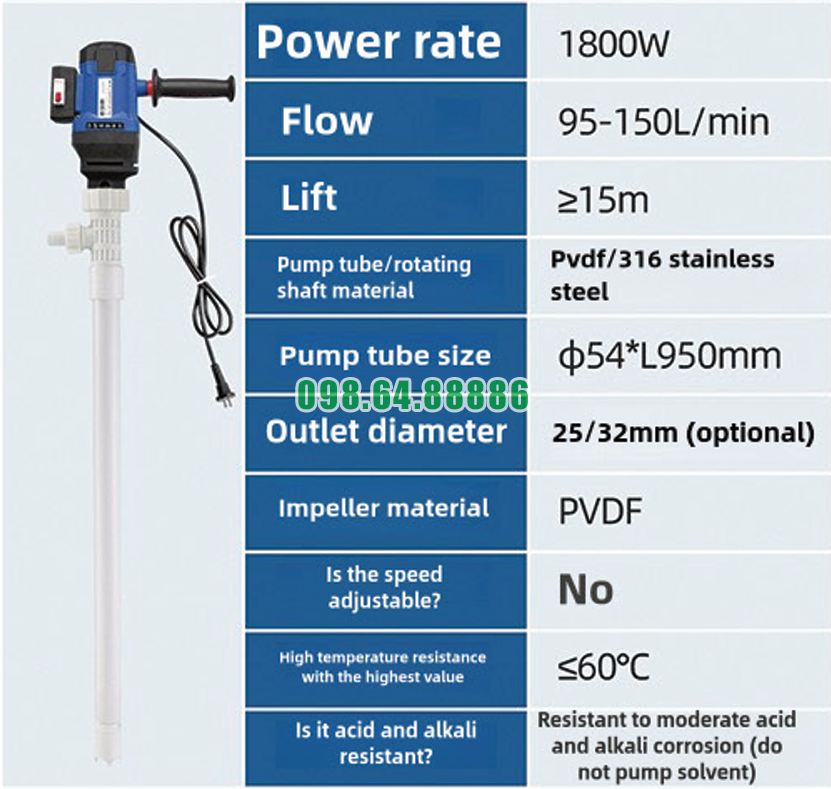 Nhờ lực đẩy mạnh từ động cơ 3500W kết hợp với cơ chế trục vít, thiết bị có thể bơm các dung dịch hóa chất đặc từ thùng phuy hoặc bồn chứa sang hệ thống sản xuất.