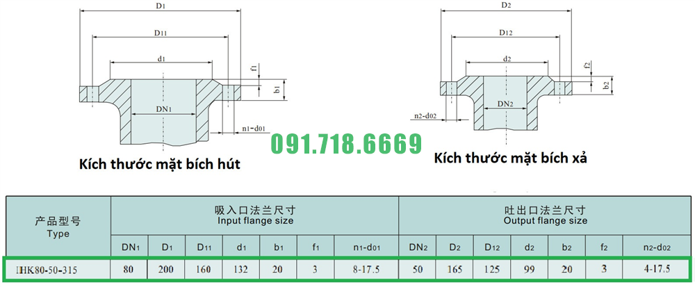 Kích thước mặt bích của máy bơm nước li tâm cánh hở IHK80-50-315 kích thước Dn80