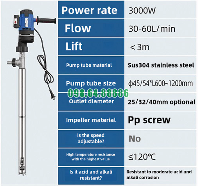 Một trong những yếu tố giúp việc lắp đặt Máy bơm điện chất lỏng JDT-3000W-LGG120 trở nên thuận tiện là ống bơm có chiều dài tối đa 1200 mm, phù hợp với thùng phuy 200L hoặc các thùng chứa lớn. Người vận hành chỉ cần đưa ống bơm thẳng xuống thùng để tiếp cận trực tiếp nguồn chất lỏng.