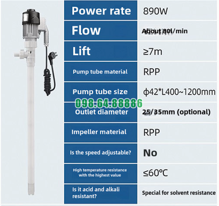 Khả năng kháng dung môi tuyệt vời của Máy bơm chất lỏng cắm trực tiếp chống cháy nổ JDT-EX890W-RPP là ưu điểm nổi bật quyết định độ bền, độ an toàn và tính ứng dụng của thiết bị trong thực tế. Nhờ sử dụng vật liệu RPP có độ bền hóa học cao, máy có thể chống lại tác động của nhiều loại dung môi công nghiệp, hạn chế ăn mòn, giảm hư hỏng và duy trì hiệu suất ổn định trong thời gian dài. Đây chính là yếu tố giúp Máy bơm chất lỏng cắm trực tiếp chống cháy nổ JDT-EX890W-RPP trở thành giải pháp phù hợp cho các môi trường làm việc thường xuyên tiếp xúc với dung môi và hóa chất.