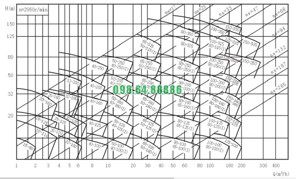 Đường cong hiệu suất bơm li tâm trục ngang mã SLW80-ISW80-315-I lưu lượng 130 m3/h