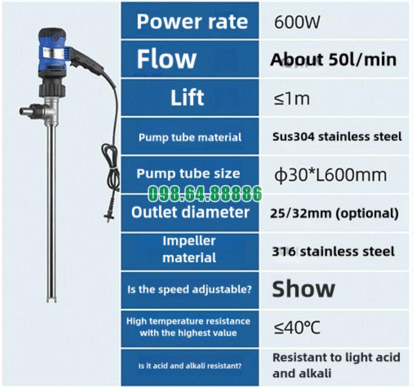 Bơm nhúng thùng phuy SUS304 JDT-600W