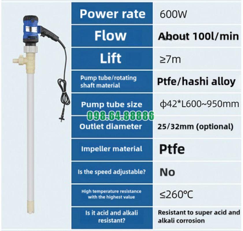 Bơm thả thùng phuy hóa chất JDT-600W-PTFE, cột áp 7m