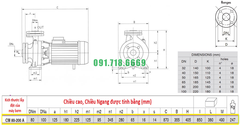 Kích thước máy bơm nước sạch li tâm CM80-200A vỏ bằng gang FC200