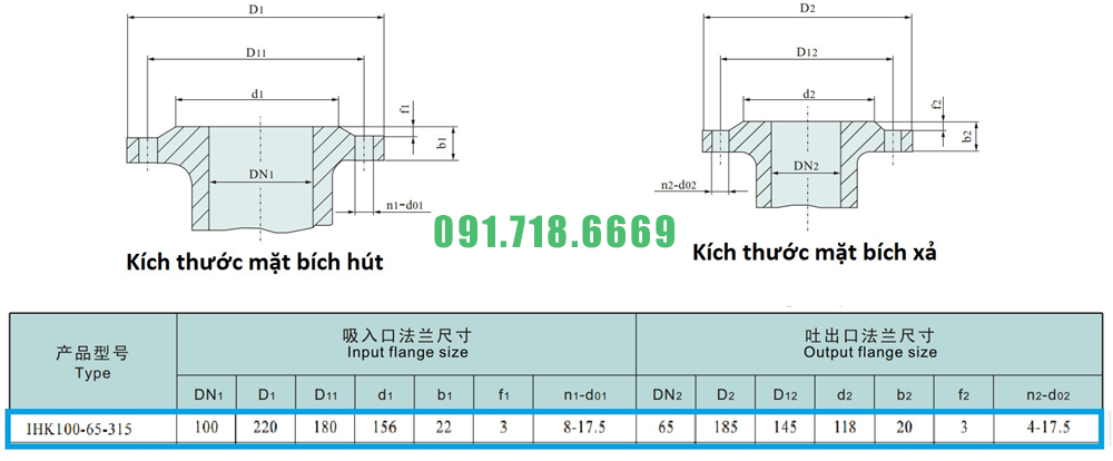 Kích thước mặt bích của máy bơm nước công nghiệp IHK100-65-315 vật liệu inox 316L