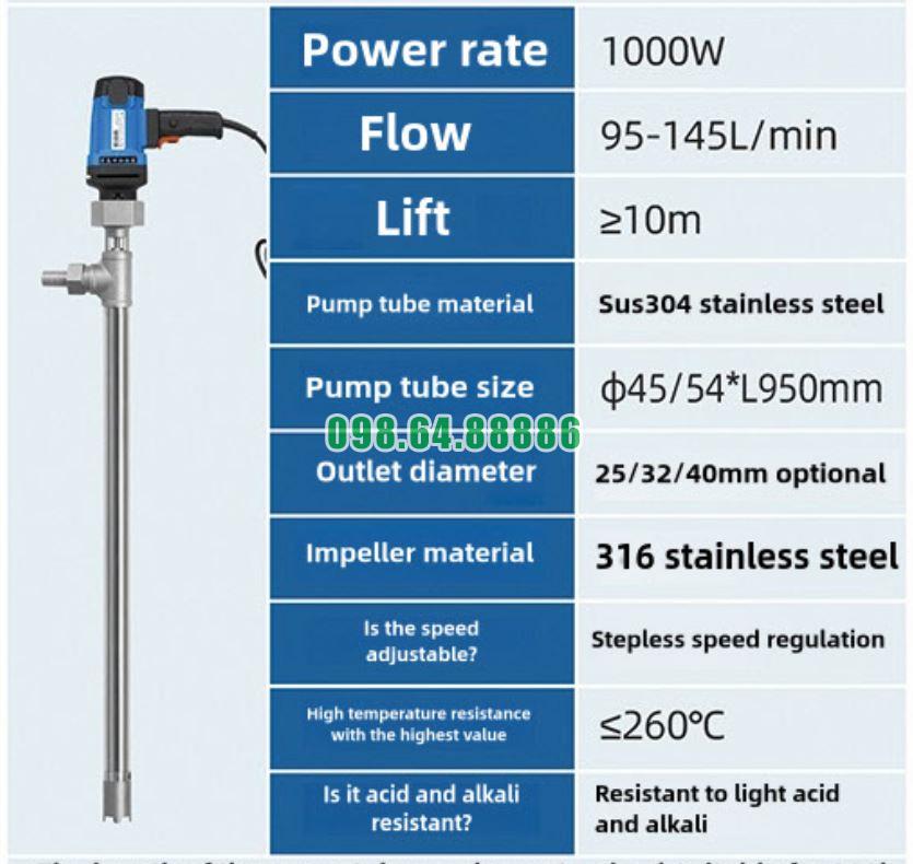 Theo nguyên lý ly tâm và truyền động trực tiếp, máy bơm thùng phuy inox SUS304/316 JDT-1000W-G260 vận hành mạnh mẽ, ổn định và an toàn. Với vật liệu inox chống ăn mòn, lưu lượng cao và áp suất ổn định, đây là thiết bị lý tưởng cho ngành công nghiệp hóa chất, sơn, xi mạ và xử lý dung môi – nơi yêu cầu bơm có hiệu suất cao và độ bền vượt trội.